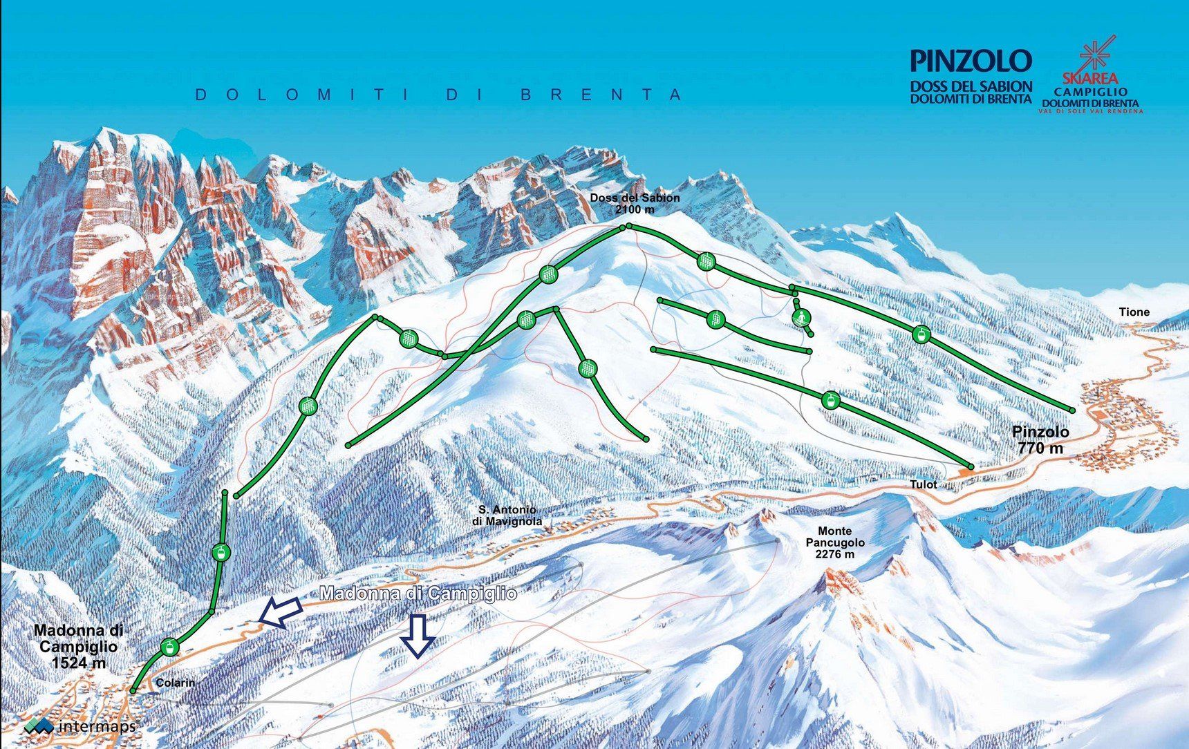 Das verträumte Pinzolo, auf einer Höhe von 770 m gelegen, befindet sich südlich des berühmten Nachbarorts Madonna di Campiglio im malerischen Val Rendena. Pinzolo bietet auch für den schmaleren Geldbeutel viele Möglichkeiten, einen unvergesslichen Urlaub zu verbringen. Das Wahrzeichen des Ortes, die alte Kirche San Vigilio, ist für seine sehenswerten Fresken bekannt.Das überschaubare Skigebiet rund um den Doss del Sabion (2.100 m) ist perfekt geeignet für die ersten Schwünge im Schnee. Dank der sanften Hänge und einem speziellen Ferienprogramm für Kinder sind auch Familien hier bestens aufgehoben. Neben verschiedenen Volksfesten, die während des ganzen Jahres in Pinzolo stattfinden, ist der charmante Ort auch Austragungsort für Skirennen des Val Rendena.